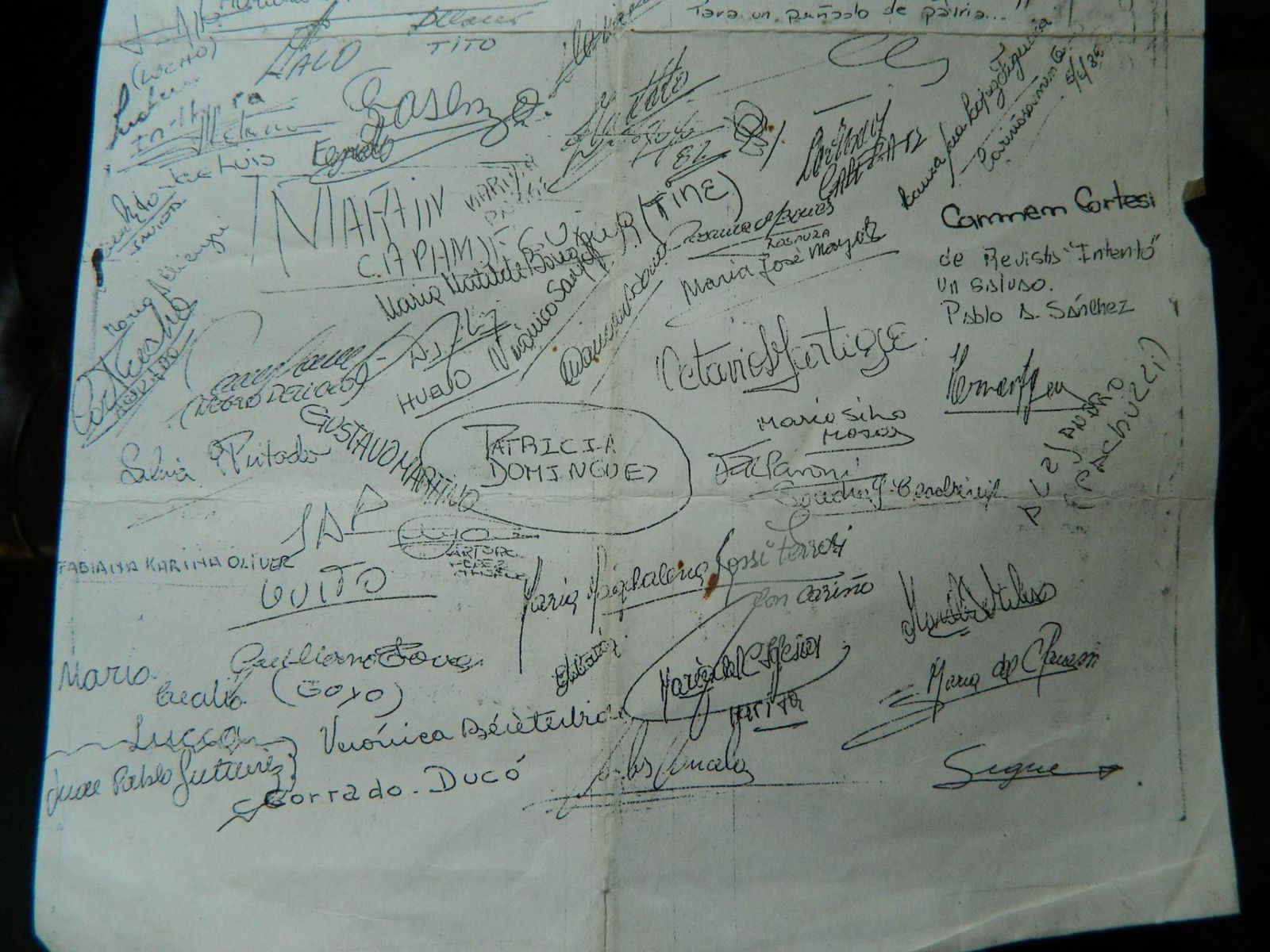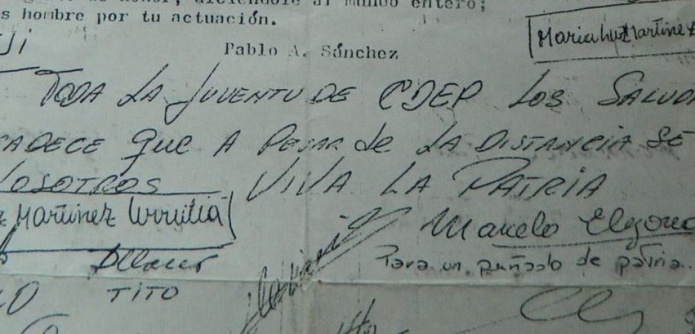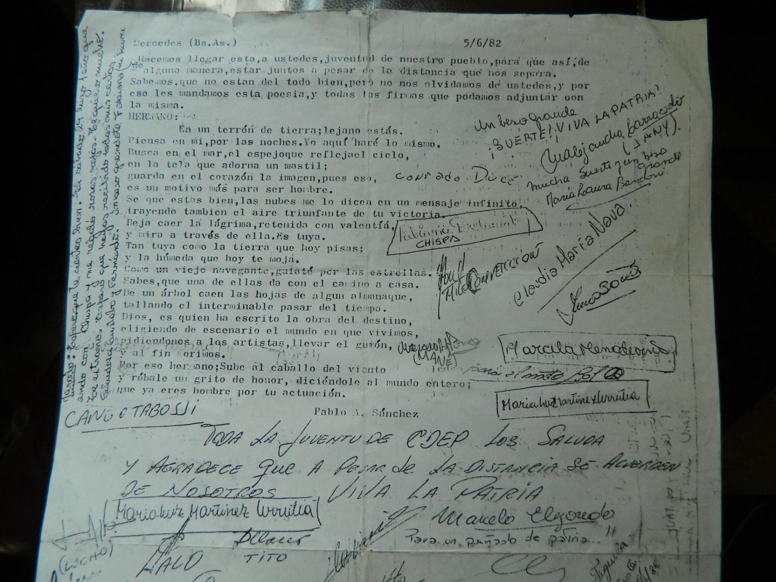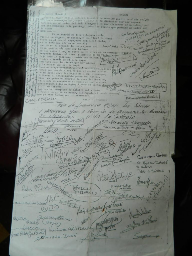 “Empieza abril…Hacemos llegar esta a ustedes, juventud de nuestro pueblo… Así comienza esta carta del 5 de junio de 1982. Parece que fue escrita por Pablo Sanchez, con una poesía de su autoría, y firmada por Toda la juventud de CdeP. Se firmó una noche en la que se cambió una entrada por un alimento no perecedero para nuestros amigos que estaban en la guerra. La recibió en Malvinas Marcelo Decunto.