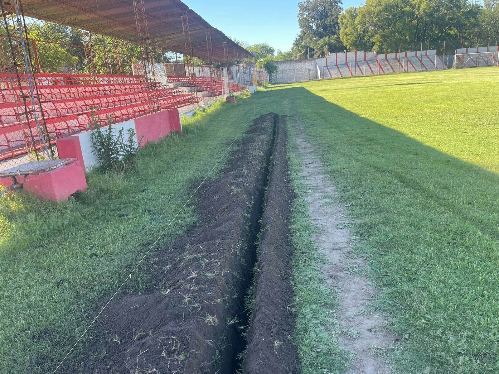“En este momento estamos trabajando en el zanjeo de unos 500 metros dentro del campo de juego”, contó el Sr. Santiago, al frente del equipo de dos personas de la empresa mercedina encargada de la obra. “Vamos a demorar dos o a lo sumo tres días. Después de eso vendrá la colocación de los caños y las bombas, y la ubicación de los aspersores”, cuya distancia entre sí aún no fue definida a la espera de analizar la posibilidad de colocar más caños debajo del campo de juego.