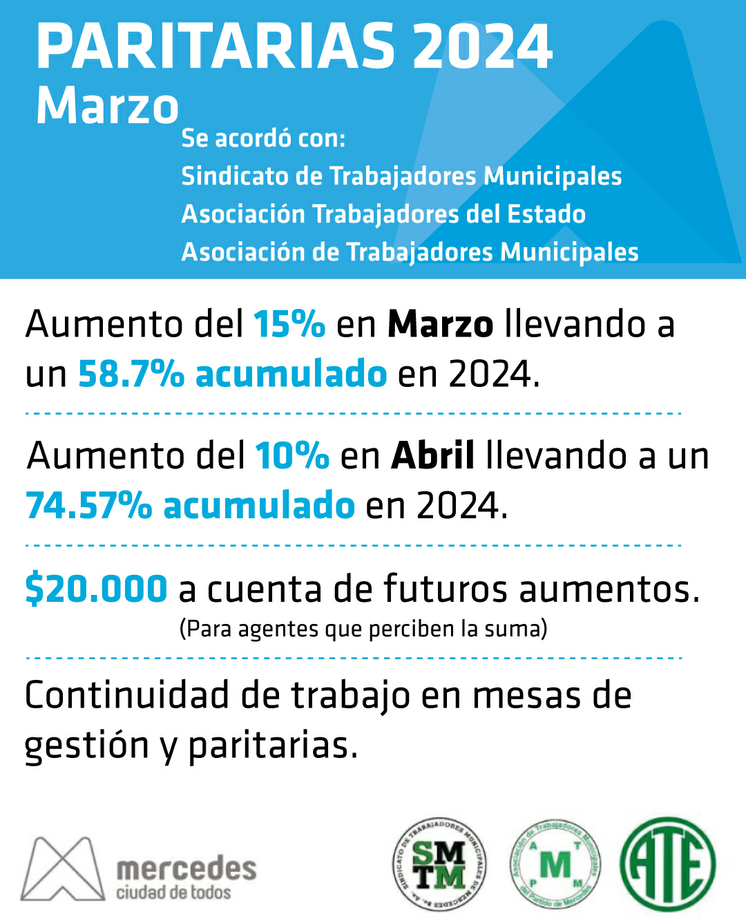 Finalmente, se acordó un incremento del 15 por ciento al salario básico, lo que lleva el acumulado trimestral al 58,7 por ciento. A su vez, se pagarán $ 20.000 extra a cuenta de futuros aumentos. Para abril se fijó, asimismo, un 10 por ciento de suba sobre el básico.