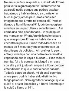 La nena caminó desde la colonia, por la 28, hasta la 39, cruzando una calle y sin ser advertida su ausencia por los responsables de la colonia. La encontró cerca de las nueve de la mañana una vecina de nombre Romina Becerra, que la cobijó y llamó a la policía al no poder identificar de dónde se había escapado la nena. “Cuando llegué estaba lleno de patrulleros”, dijo la madre. “Lo que pasó es muy grave. Emma no sabe cruzar la calle sola, no reconoce el peligro. Ni siquiera podía decir su nombre porque todavía no habla bien. Es grave y es triste, una desgracia con suerte. Hubo muchos factores que hicieron que no pasara algo más grave, que la atropellara un auto o que alguien se la llevara. Es escalofriante pensarlo. En la colonia me dijeron que no entienden cómo salió”.