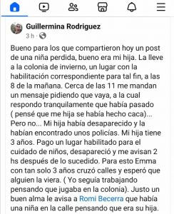 La noticia circuló el miércoles en redes sociales y fue la propia madre de la niña, Guillermina Rodríguez, quien finalmente echó luz sobre lo sucedido. Realizó un posteo contando que desde el pasado lunes enviaba a su hija Emma, de tres años de edad, a la colonia El Pescadito, ubicada en 37 entre 28 y 30. “La anoté porque trabajo, entonces la enviaba en el horario de 8 a 12 hs. Elegí ese lugar porque le tengo gran aprecio a su dueña. Ayer (por el miércoles) la dejé a las 8 y a las 11 recibo un WhatsApp pidiéndome que vaya. Pensé que la nena se había hecho caca y necesitaban que la cambie, pero no. Me dicen: ‘la nena se fue y la encontró la policía”, narró la mujer en diálogo con Mario Oscar Mango por Radio Meridiano.