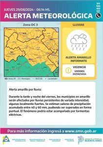María Agustina Loré, responsable de Protección Civil municipal, advirtió que el alerta emitido por el Servicio Meteorológico Nacional se extiende también al día sábado. Si bien desestimó que pueda haber una gran actividad eléctrica en la zona, sí anunció que habrá una lluvia persistente junto con viento intenso.