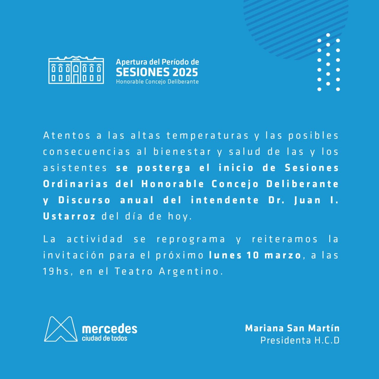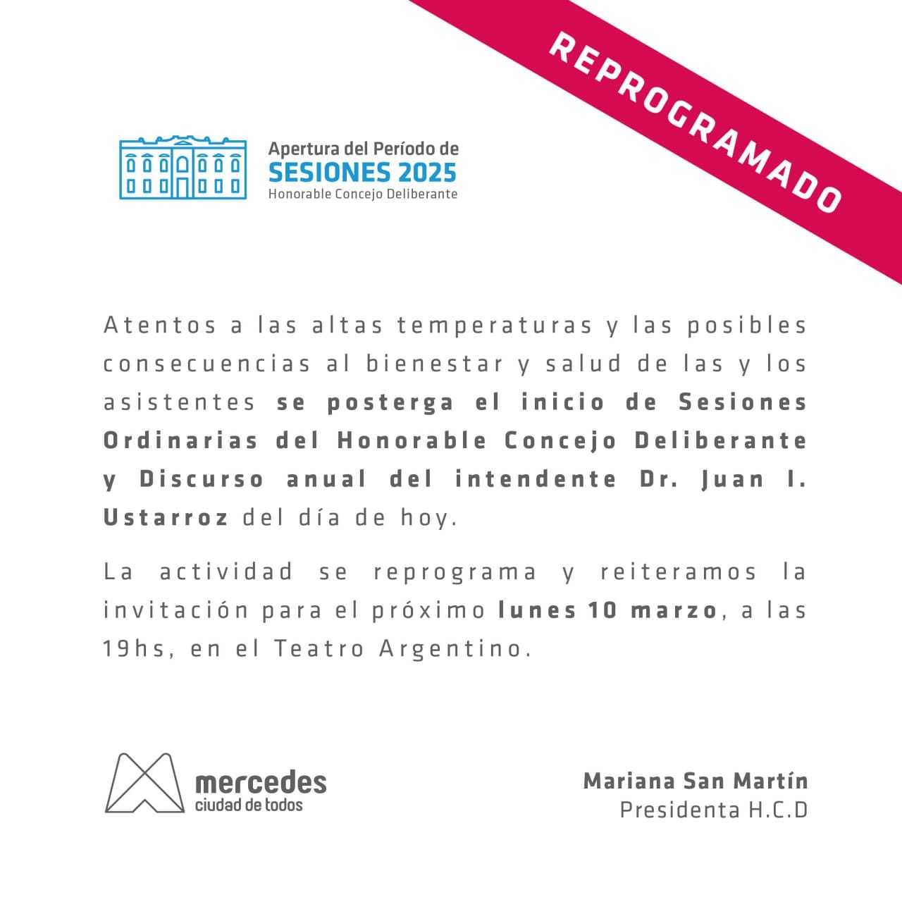 El acto de inicio de las sesiones ordinarias estaba previsto para este jueves a las 19 hs en el Teatro Argentino. En horas del mediodía, tanto el Ejecutivo como el Concejo Deliberante emitieron sendos comunicados informando que, ante la ola de calor que afecta a la región y que ñ se extenderá al menos hasta el viernes, el evento se trasladó al lunes 10 de marzo a la misma hora y en el mismo lugar.