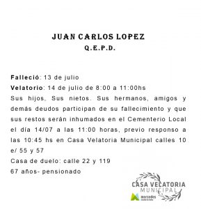 14 julio, 2025 Juan Carlos Lopez También te puede interesarHERMINIA ROSA ROSSELLO VDA DE DIEGONELBA RENE AGUIRRE de DESPALANQUESALDO ANÍBAL DEMATEI Q.E.P.DJOSÉ EDUARDO AGUILERAERNESTO ELIAS BARRIOS Q.E.P.DRAFAELA NELIDA MANDAGLIO DE DEL VECHIOGRACIELA MABEL MARTINEZ VDA DE ECHAZU LEZICAMARIA LUISA BELTRAME vda DE CAPUTO in Fúnebres Share