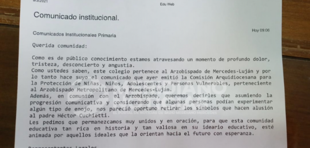 El Instituto Padre Ansaldo emitió un comunicado a los padres del colegio donde detallan su decisión de retirar la placa que llevaba el Nombre de Héctor Cuchietti. Según detalla el texto lo hicieron “considerando que algunas personas podían presentar algún tipo de enojo”. El comunicado llega luego de que se hiciera pública la denuncia por abuso contra el padre y el pedido de un grupo de mujeres víctimas de retirar el nombre del sacerdote a la calle 114.