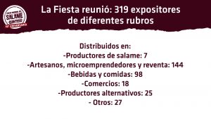 El ingreso económico para la ciudad en todas las áreas se aproximó a los 370 millones de pesos, dijo. Se cortaron más de 20.000 tickets generales y 3.115 de jubilados. Hubo en el Parque 319 expositores, entre ellos siete productores de salame quintero, 144 artesanos y microemprendedores, y casi un centenar de vendedores de comidas y bebidas. A lo largo de los tres días que duró la celebración se presentaron cincuenta números artísticos, en su mayoría locales.