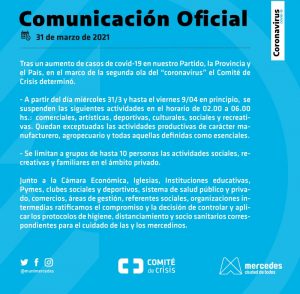 A partir de hoy miércoles 31 hasta el 9 de abril en principio, en nuestra ciudad se aplicarán las medidas de restricción anunciadas en el Boletín Oficial de la provincia de Buenos Aires para 110 municipios que se encuentran en fase 4.