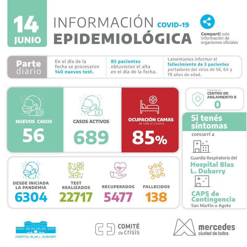 Lamentamos informar el fallecimiento de 3 pacientes portadores del virus de 56, 64 y 79 años de edad, que suman un total de 138 fallecidos desde el inicio de la pandemia.