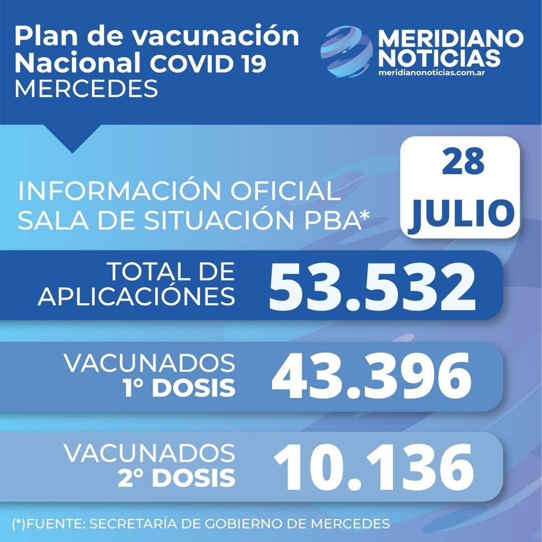 Sobre una base de 53.532 inscripciones, 43.396 mercedinos y mercedinas ya recibieron la primer dosis de la inmunización, y 10.136 de ellos completaron el calendario de vacunación.