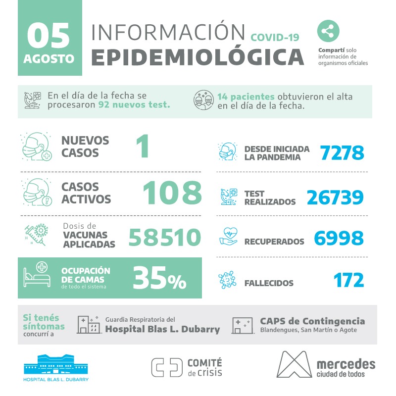 El último parte epidemiológico brindado por las autoridades municipales informó que de 92 test realizados se detectaron 1 nuevo caso de COVID-19 y hay un total 108 vecinos transitando la enfermedad.