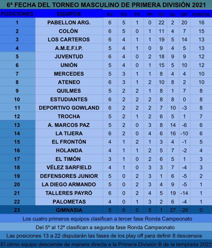 La tabla de posiciones quedó liderada por Pabellón Argentino con 16 puntos y de cerca lo siguen Colón de Luján con 15 y Los Carteros con 13.