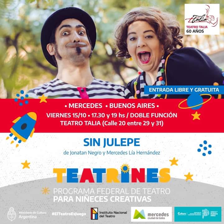 Hoy en el Teatro Talía habrá dos funciones de la obra “Sin Julepe”, teatro y música hecha para chicos por payasos. La obra, de Mercedes Lía Hernandez y Jhonatan Negro, llega en el marco del programa TEATRINES del Instituto Nacional del Teatro.