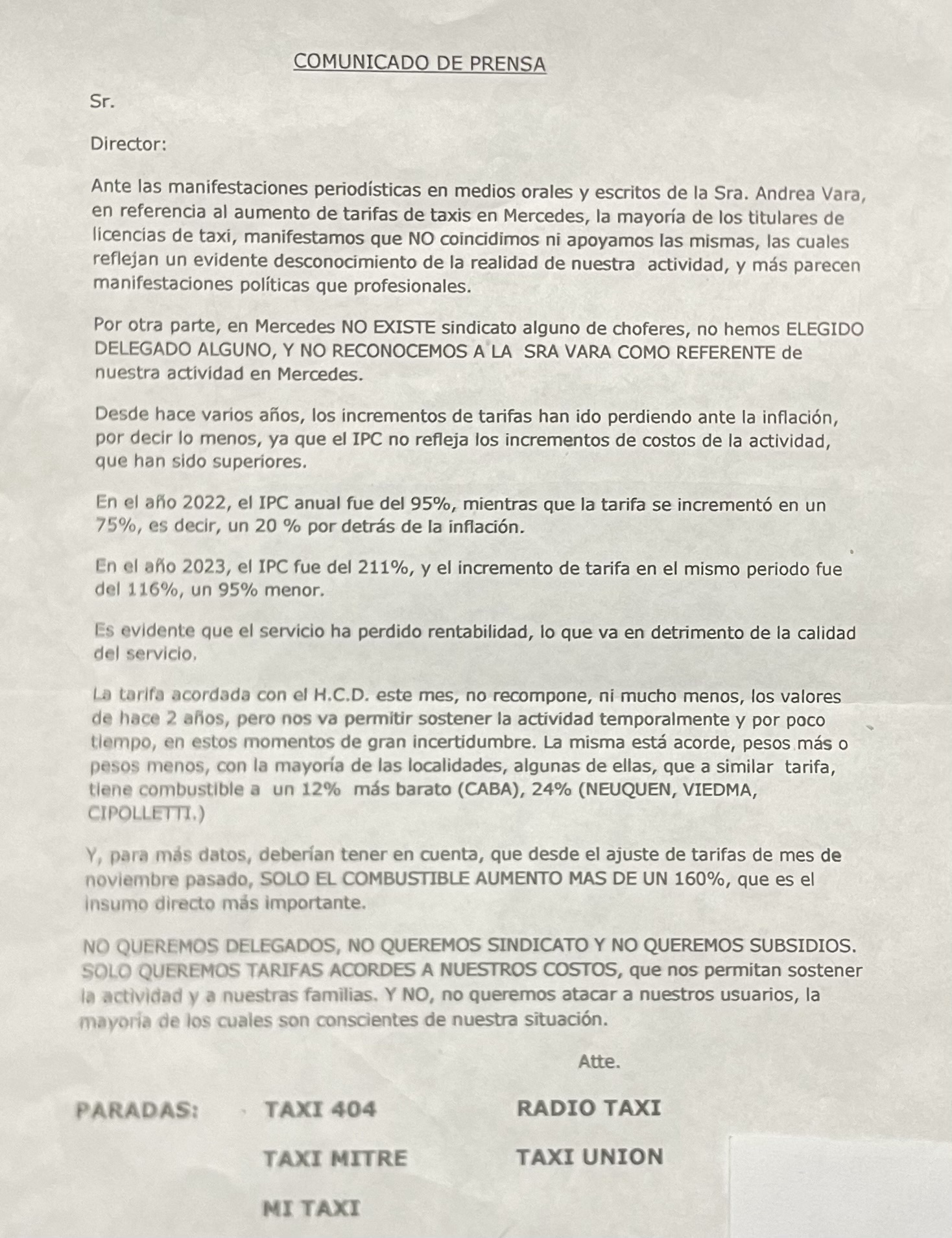 En el parte difundido, el grupo de taxistas también hace referencia a los dichos de la delegada Andrea Vara en nuestro medio y dicen que “ante las manifestaciones periodísticas en medios orales y escritos de la Sra. Andrea Vara, en referencia al aumento de tarifas de taxis en Mercedes, la mayoría de los titulares de licencias de taxi, manifestamos que NO coincidimos ni apoyamos las mismas, las cuales reflejan un evidente desconocimiento de la realidad de nuestra actividad, y más parecen manifestaciones políticas que profesionales”.