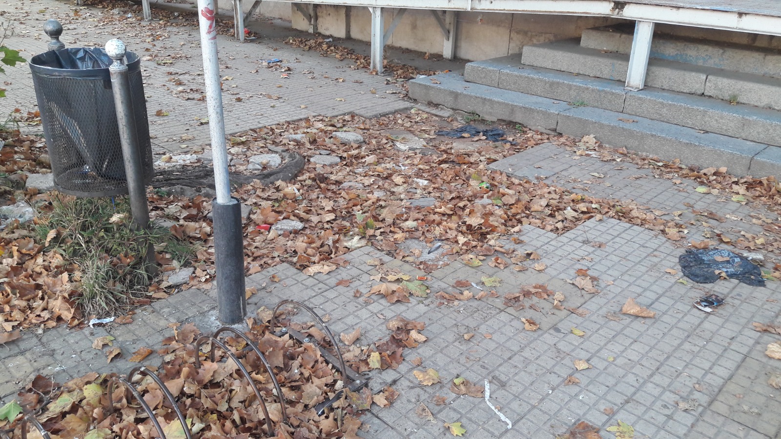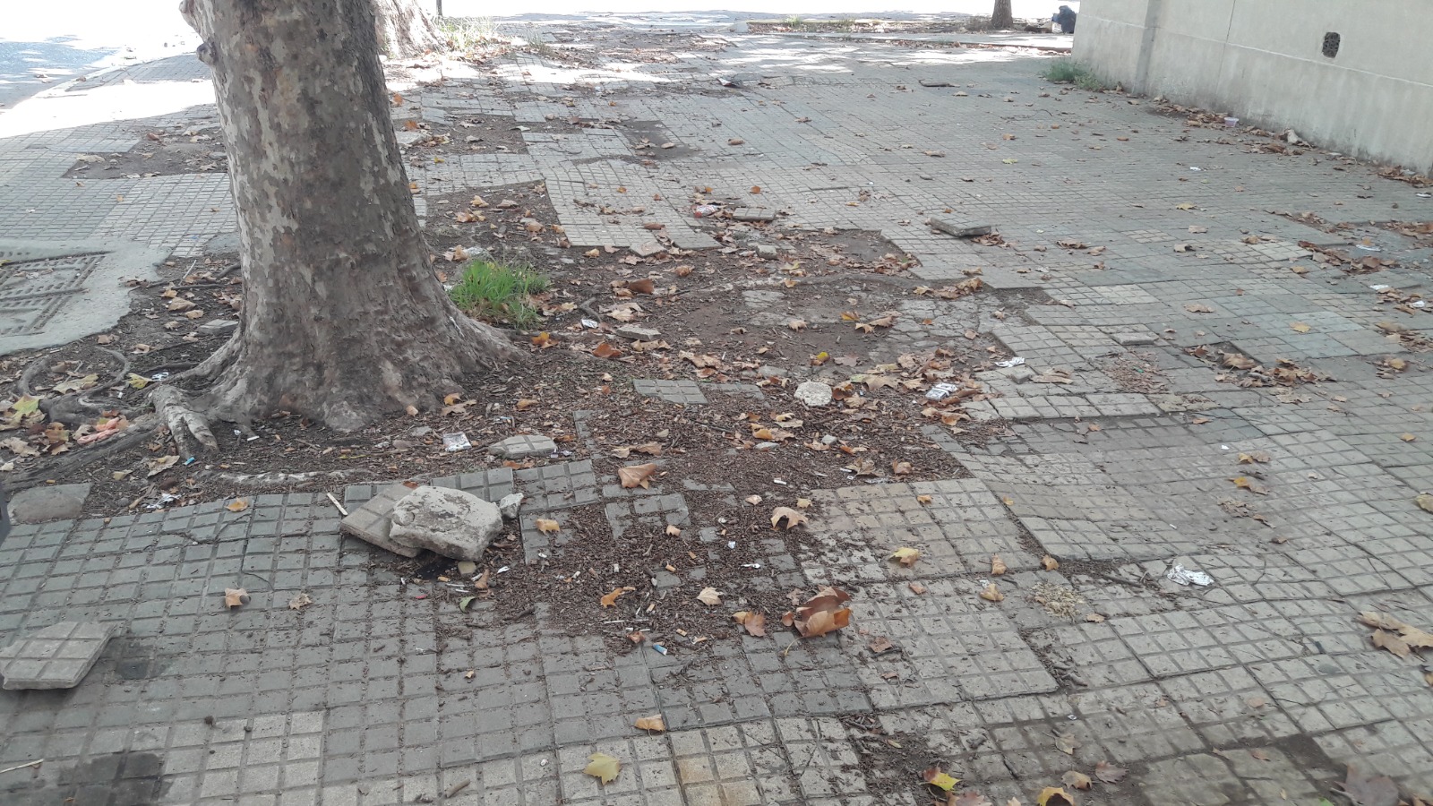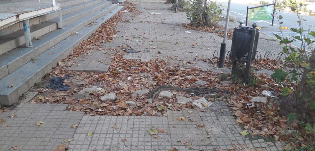 Las raíces enormes de los árboles están haciendo estragos con las baldosas, que se cuentan de a miles. Las roturas son grandes e importantes. En algunos lugares faltan y en otros están flojas, lo que representa un verdadero peligro para quienes transitan por el lugar. Las hojas acumuladas, que ocultan los pozos, representan un riesgo extra.