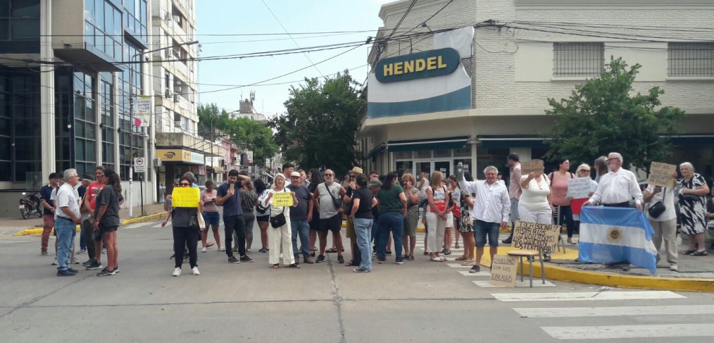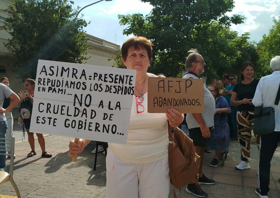 Jubilados, pensionados y representantes de distintas organizaciones gremiales se manifestaron frente a la sede de la obra social en Mercedes contra el despido de tres trabajadores y los recortes a la clase pasiva.