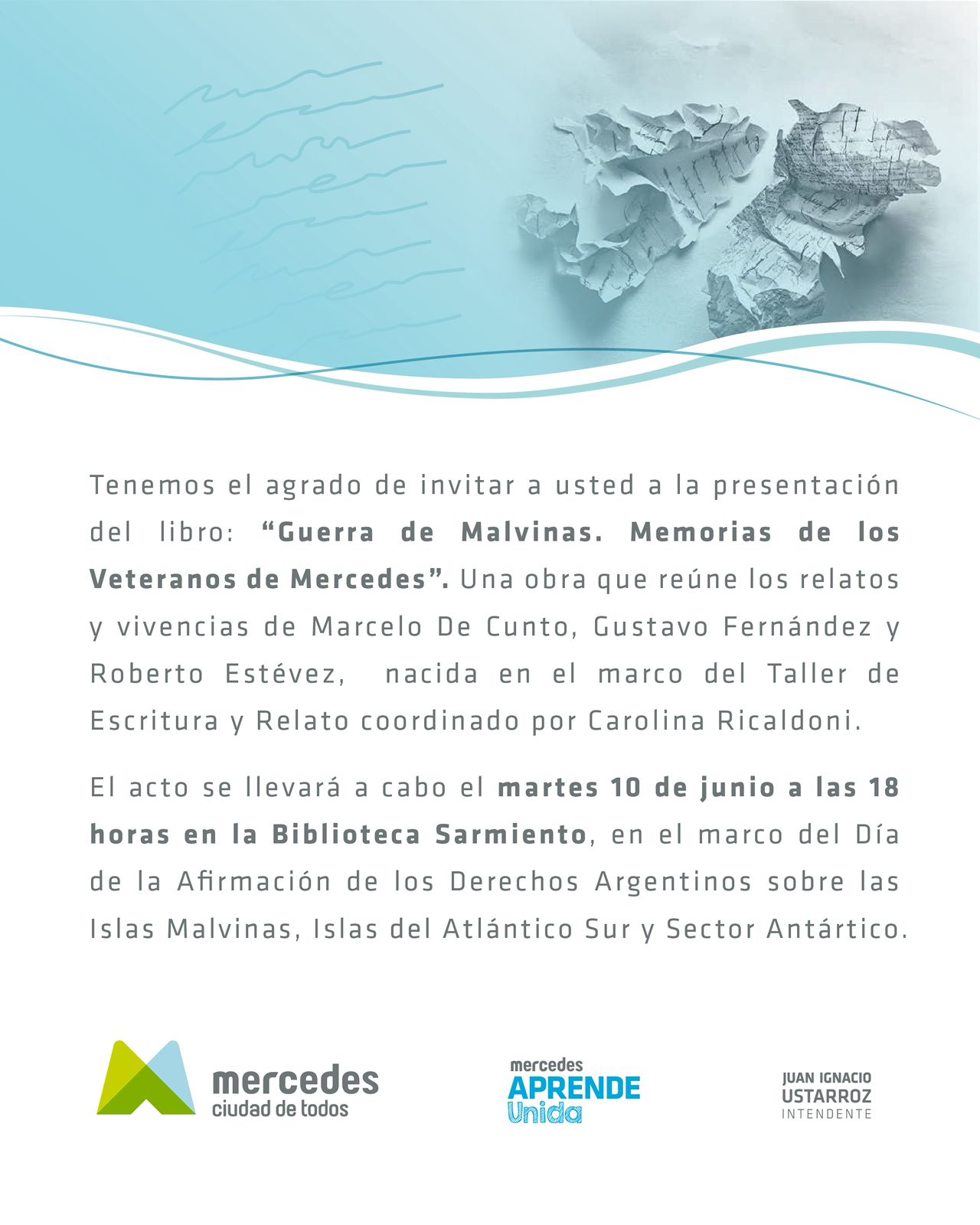El libro, que será presentado desde las 18 hs en la Biblioteca Sarmiento (Av. 29 entre 28 y 30), recoge las vivencias de los excombatientes Marcelo De Cunto, Gustavo Fernández y Roberto Estévez. Lleva por título ‘Guerra de Malvinas. Memorias de los veteranos de Mercedes’. “La idea original fue de un psicólogo que trabajó con ellos, Gustavo Urpianello. Gustavo había participado antes de un taller mío y me acercó esta propuesta, que yo les presenté a los veteranos en una reunión y que contó con el apoyo de la Dirección de Cultura municipal. Cada jueves, de mayo a diciembre (del año pasado), fueron escribiendo sus memorias, en un momento en el que los derechos humanos están en juego en la Argentina”, expresó Ricaldoni en comunicación con Radio Meridiano.