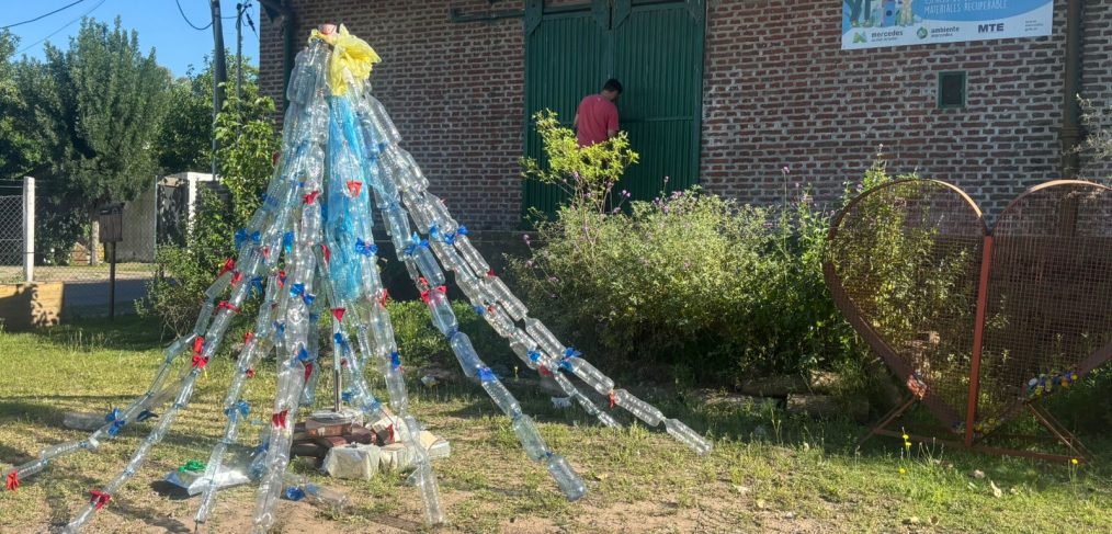 • Un bello arbolito de Navidad fue levantado por el personal de la Dirección de Ambiente y del Movimiento de Trabajadores Excluidos (MTE) en 29 y 6, allí donde se recepciona el material para reciclar. Está hecho con botellas plásticas de 1,5 y 0,5 litro, sifones de soda, moños de color rojo, azul y amarillo, y varios libros que hacen las veces de regalos.