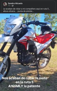 La moto, una XR190 de colores rojo y blanco, llevaba la patente A165MLY. El martes cerca de las 21.40 hs, Escobedo y un compañero viajaban hacia la estación de peaje de Olivera, donde debían tomar su turno laboral a las 22 hs. “Como era temprano íbamos despacio, a 90 o 100 kilómetros. En eso se me arrimó una moto con dos hombres y me empezaron a amenazar con una pistola. Tuvimos que parar y darles todo. No tuvimos chance de nada”, contó el motociclista por Radio Meridiano.