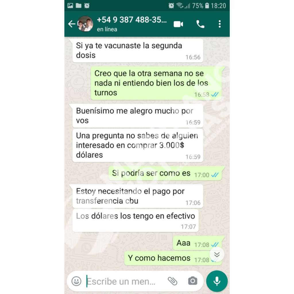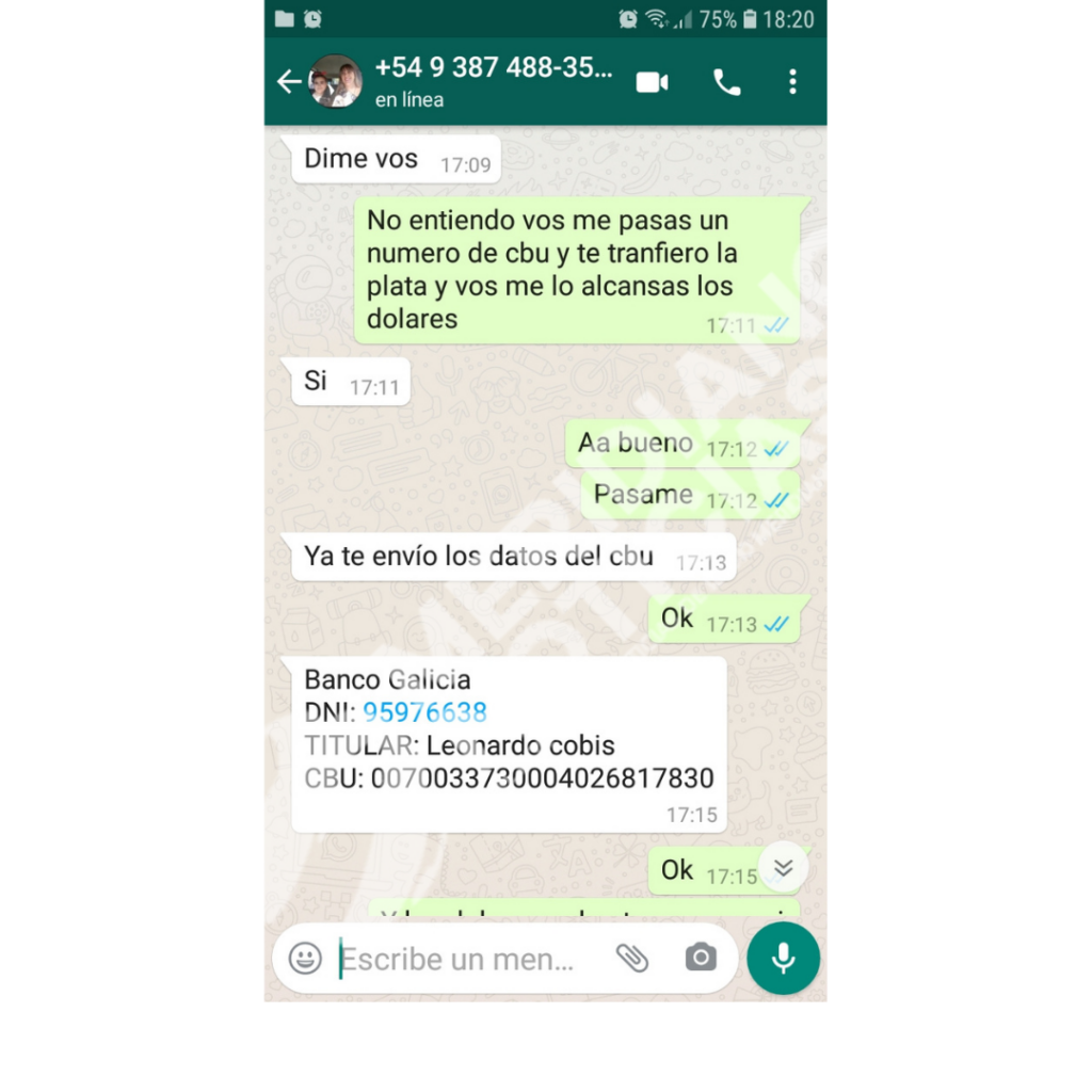 El procedimiento consta de un saludo inicial anunciando que se ha cambiado el número telefónico. Si la persona responde, el delincuente continúa con una conversación formal sobre la pandemia y consulta sobre la vacunación. Luego de lograr una mínima confianza, si la otra persona sigue respondiendo, consulta sobre si sabe de alguien con posibilidad de comprar USD 3.000. Si la víctima muestra interés, el ladrón apura la situación aludiendo que “está ocupada” y debe recibir el dinero lo antes posible en un CBU a nombre de “Leonardo Cobis” perteneciente al Banco Galicia y que luego enviará el dinero en efectivo. Lamentablemente, uno de los contactos no percibió el engañó y también fue víctima de otro ilícito, quien debió hacer la denuncia pertinente.