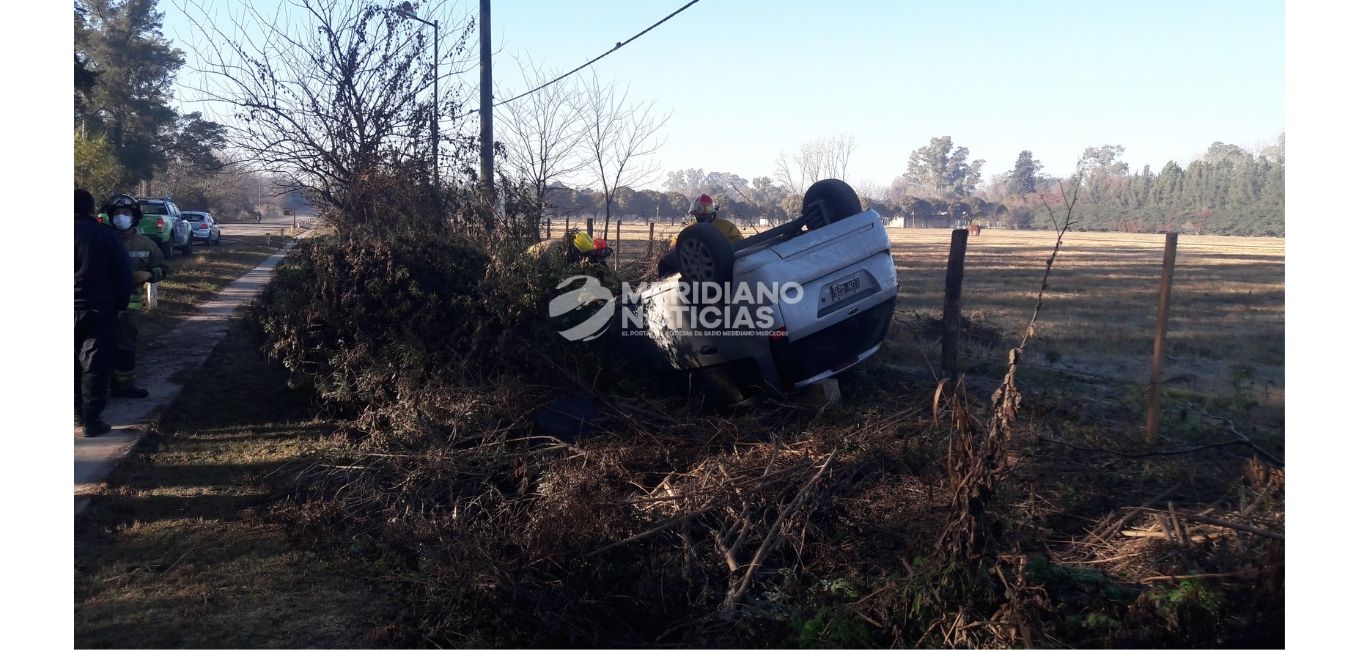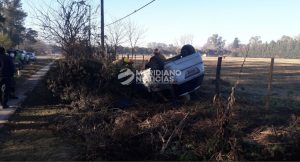 Se produjo el vuelco de un auto en la cercanía de la colectora de Ruta Nacional 5 a 200 metros del asfalto. En el camino de tierra a Altamira, por causas que aún se desconocen y se investigan, un Ford Fiesta que transitaba en dirección Altamira-Ruta 5, se cruzó de mano y terminó dado vuelta en la zanja sobre el alambrado de un vecino. Según informó Bomberos Voluntarios, la persona que conducía fue quien realizó el llamado de auxilio cerca de las 9 30 de la mañana.