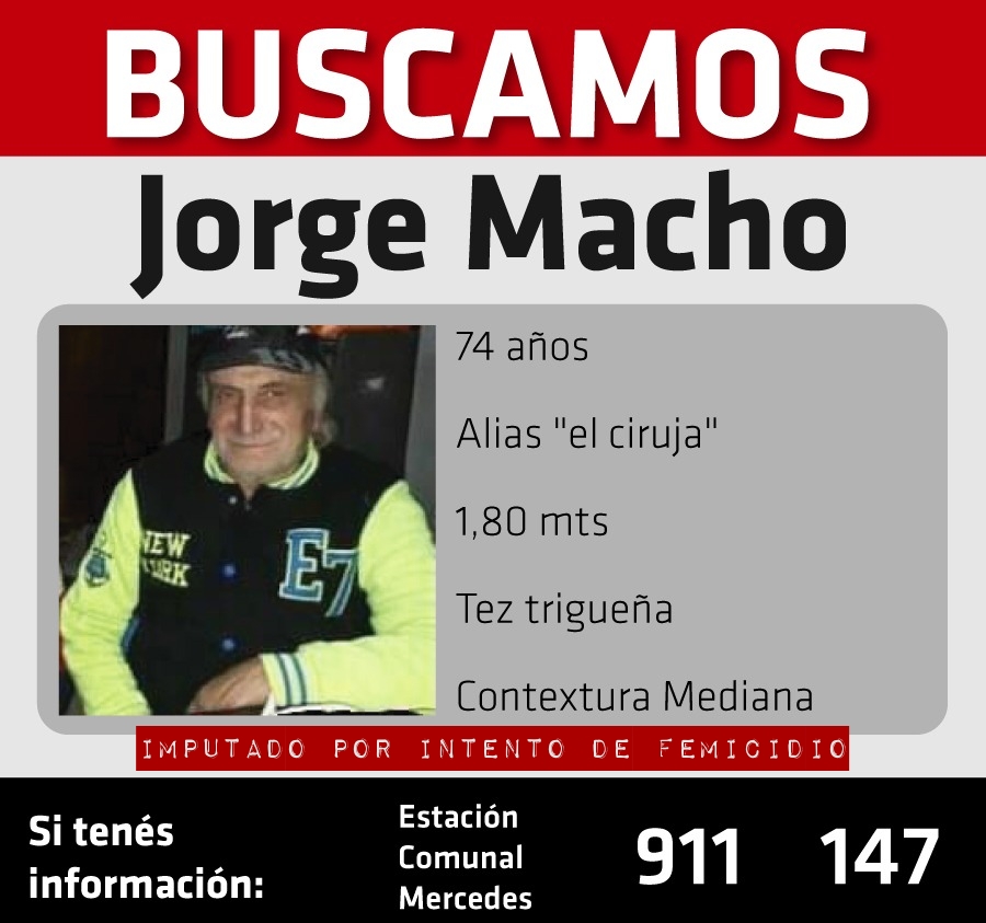 La UFI n 4 de la localidad de Mercedes dictó el pedido de captura para Jorge Macho de 74 años quien está imputado por  intento de femicidio ocurrido la semana pasada. Guadalupe González, directora de Políticas de Género y Diversidad de Mercedes comentó que, desde la Secretaría de Seguridad local están trabajando y brindando todo el apoyo necesario para aportar a la búsqueda así como información a la fiscalía a cargo del Dr. Lisandro Massón. Mientras, desde su cartera trabajan con la familia en la asistencia y contención psicológica.