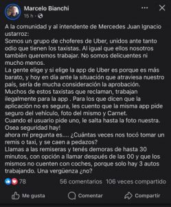 “Nosotros no tenemos ningún problema con Uber, nos manejamos bastante bien. El hecho es que los taxistas están en contra nuestro. Deberían dejar que la ciudadanía elija cómo quiere viajar. Ellos nos están mandando a secuestrar (los vehículos), a que nos siga el Municipio y nos haga una multa”, contó Sierra en comunicación telefónica con Radio Meridiano. El hombre estaba desempleado y disponía de movilidad propia. Fue por eso que optó por hacerse “socio de la app” y empezar a prestar el servicio de traslado de pasajeros.